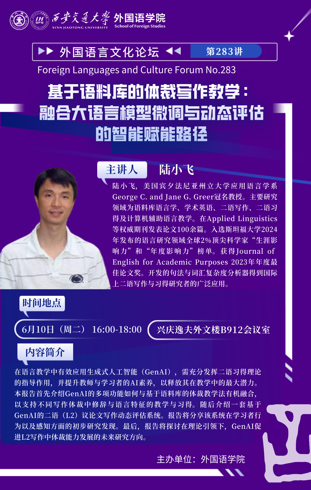 时间 6月10日(周二)16:00-18:00 地点 兴庆逸夫外文楼B912会议室