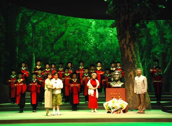 舞台上周长安的出现,呼应了孟冰茜的光彩照人并非个别现象。这个土生土长的陕西籍教授,浑身豁透着秦人的豪放与质朴,同时性格中也飘逸出几许饶有特色的“粗糙”。他耿直敦厚、爱憎分明,不仅根红苗正,而且在“专业上堪称一流,科技成果连连获国家大奖”,可是他甘当助手,在事业上倾力支持大教授苏毅。当看到下一辈人苏小眠献身边疆为国家的科技建设奉献青春却买不起房子、还看着黑白电视机的窘境时,他毫不在惜自己的身份,上街卖字来送上自己的爱心。勇于担当、无私奉献的精神在他的身上时时怒放。另一方面,他飞扬的个性,展示出一个扎根于现实土壤、流淌着普通人七情六欲的生动感人形象。性格的两种情愫经纬交织,在美学层面上释放出了伟岸与崇高的道德情操和精神力量