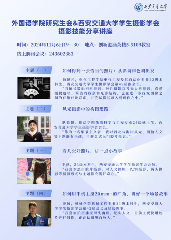 外国语学院研究生会荣幸地邀请到了西安交通大学学生摄影学会会长游畅等嘉宾为我院同学举办摄影技能分享讲座,欢迎对摄影感兴趣或者想要加入西安交通大学学生摄影学会的小伙伴们前来参加哦!届时嘉宾还会分享如何更好地使用手机拍摄,大家可以一起交流,共同探索光影的魅力~