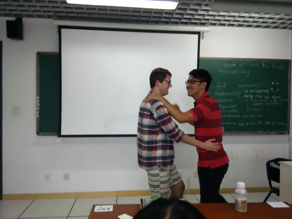 关切的眼神、鼓励的话语、嘴角边总是带着淡淡恬美的微笑, Hendrik就像我们的大哥哥一样,认真地倾听着我们的每一次发言,即使当我们一时语塞的时候,他也会耐心地等待我们组织语言,当我们完成发言后总是给出极高的评价。在交流的过程中,Hendrik详细地记录下我们每个人发音中这样或那样的小瑕疵,并善意地指出例如“sink”与“think”的发音的不同与要点,并给予我们每个人中肯具体的建议。Kym则更像是邻家的大姐姐,在每天下午的活动中,带着我们去进行各式各样的有趣的课堂实践,鼓励并引导着我们勇敢地站起来、大声地说出自己心中的话。Kym永远是我们的欢乐天使,她爽朗的笑声、外向的性格让她成为我们无话不谈的好朋友。在他们的帮助下,我们学会了如何用更加地道的英语去交流彼此的想法,学会了如何与不同性格的人一同进行团队合作。