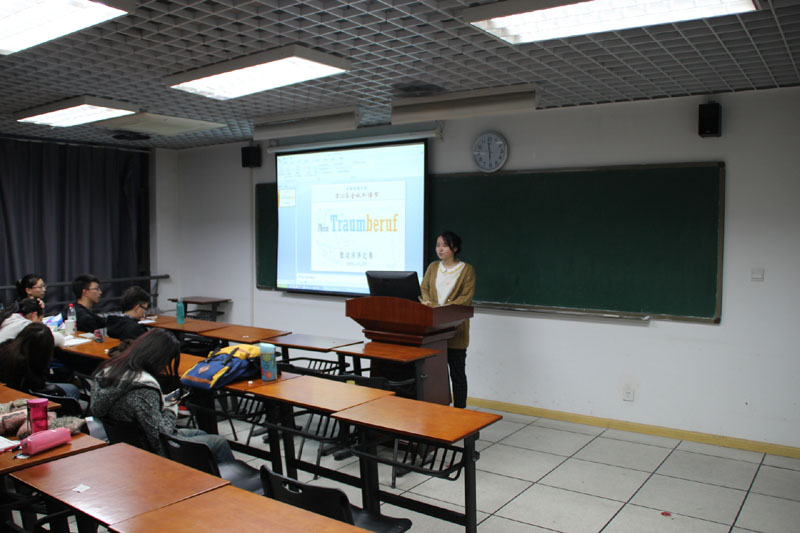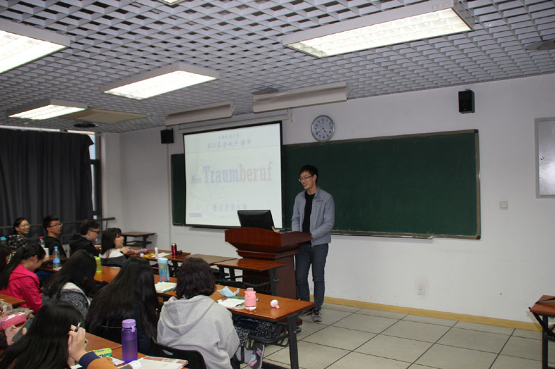 比赛开始前,比赛选手进行抽签及排序。短暂的暖场过后,演讲比赛拉开了序幕。比赛以"Mein Traumberuf(我的理想职业)"为主题,27名来自英德双语和理工科专业的学生从不同角度,流利、沉稳、机智的阐述了自己对于未来职业与生活的畅想和希冀。在这过程中,有选手提出了大多数在校学生面临的问题既有对于未来职业的迷茫,也有选手坚定自己追求理想的信心;有选手幽默的讲述了自己从小对于未来的幻想,也有选手经过深思熟虑说出了自己对于职业选择的见解。