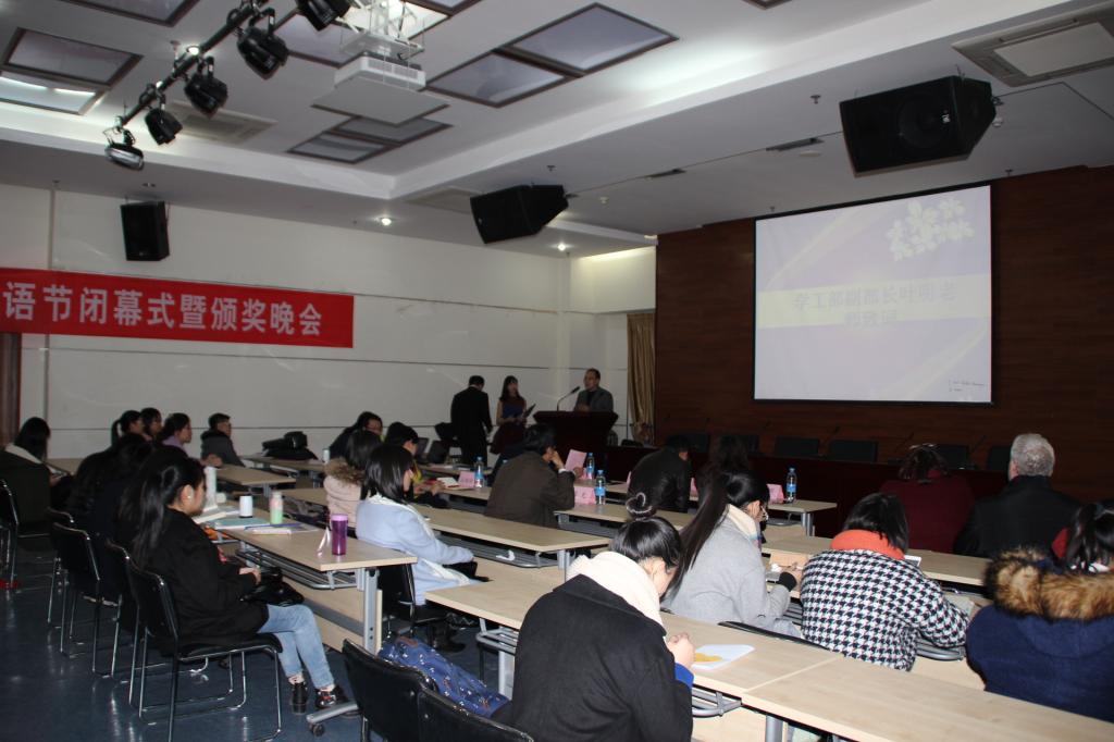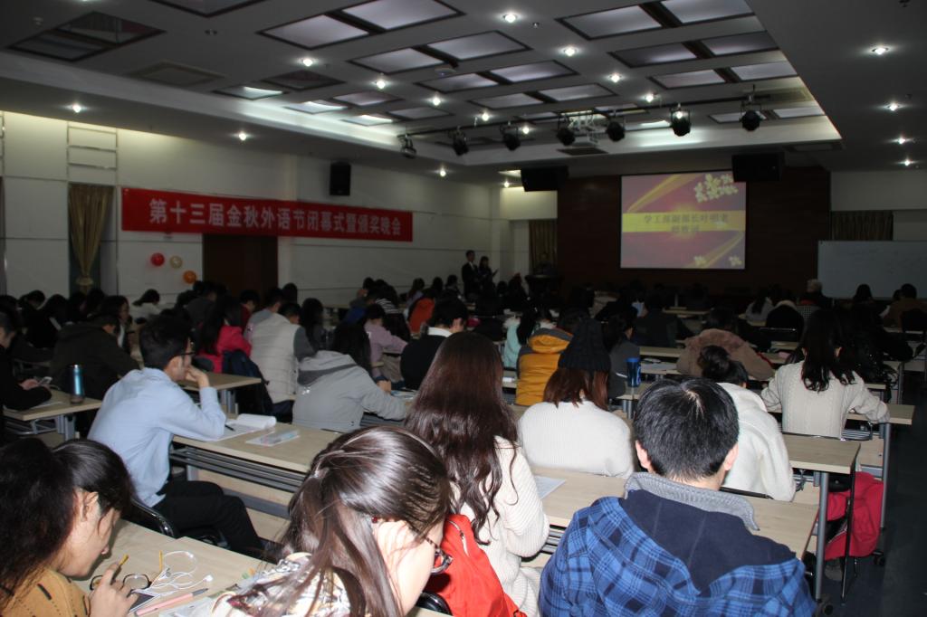 各项比赛回顾视频带大家回首了第十三届金秋外语节的整个历程。之后,闭幕式正式拉开帷幕,首先由叶明老师致辞,他说道,“金秋”是收获的季节,外语节在秋高气爽的时节开幕,见证了大家的勤奋努力和累累硕果,他希望金秋外语节能吸引更多的同学积极参加,给大家提供一个检验知识水平、展示学习成果、欣赏才艺的平台,打造成校园中一道富有异域风采和特色的亮丽风景线,也相信学校将不断给予更大的支持、关注,使金秋外语节影响更大、范围更广。