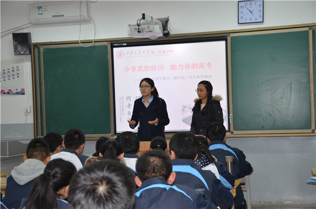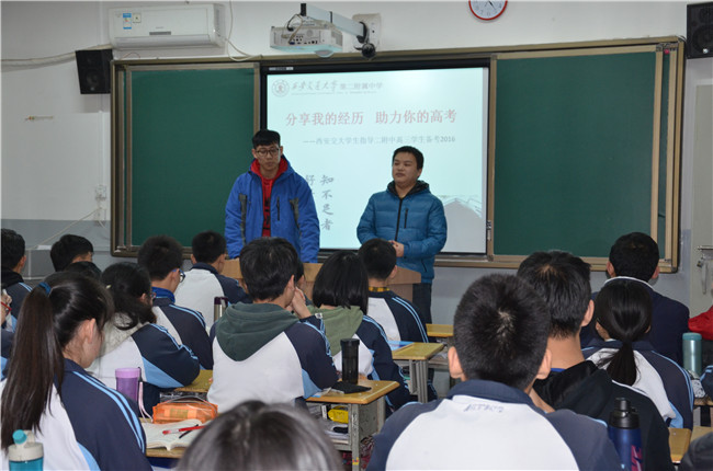 在交流会上,四名同学分别介绍了自己的高三心路历程、学习方法,特别是英语学习方法、应试经验等。他们用自己的切身经历激励二附中应届毕业生们拼搏奋斗、备战高考。作为“首批陕西省高中示范学校”的优秀毕业生,廖梓安同学英语口语发音纯正,思路清晰。她主要介绍了高中英语学习,尤其是英语写作的学习经历、以及大练习经验,她还和同学们分享了自己母校综合评价名列第一的一位同学的学习故事。巩卓青同学学业成绩位居年级第二,担任班长。她分享了作为一个学霸的奋斗经历和高三学习过程中的教训。徐晨曦同学毕业于另一所“首批陕西省高中示范学校”,他的特点是善于思考,长于沟通。会上,他主要讲述了自己的奋斗史和如何培养心理素质,如何自我调节心理状态。态。胡宸瑞同学英语写作能力强,主要表现在逻辑思维能力清晰,善于应用准确的语言表达自己的思想, 他的学业成绩年级第三,担任心理委员,做过四六级考试经验交流会。他和同学们分享了自己的高三心路,重点介绍了自己如何从迷茫中到找到奋斗的方向,还有重要的理综学习方法,对于高三同学关心的如何提分,刷题的热点问题,他也作了精彩的解答。
