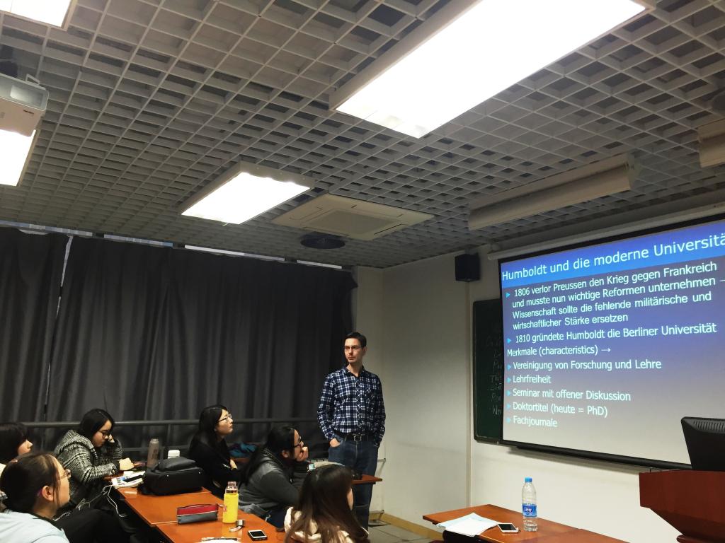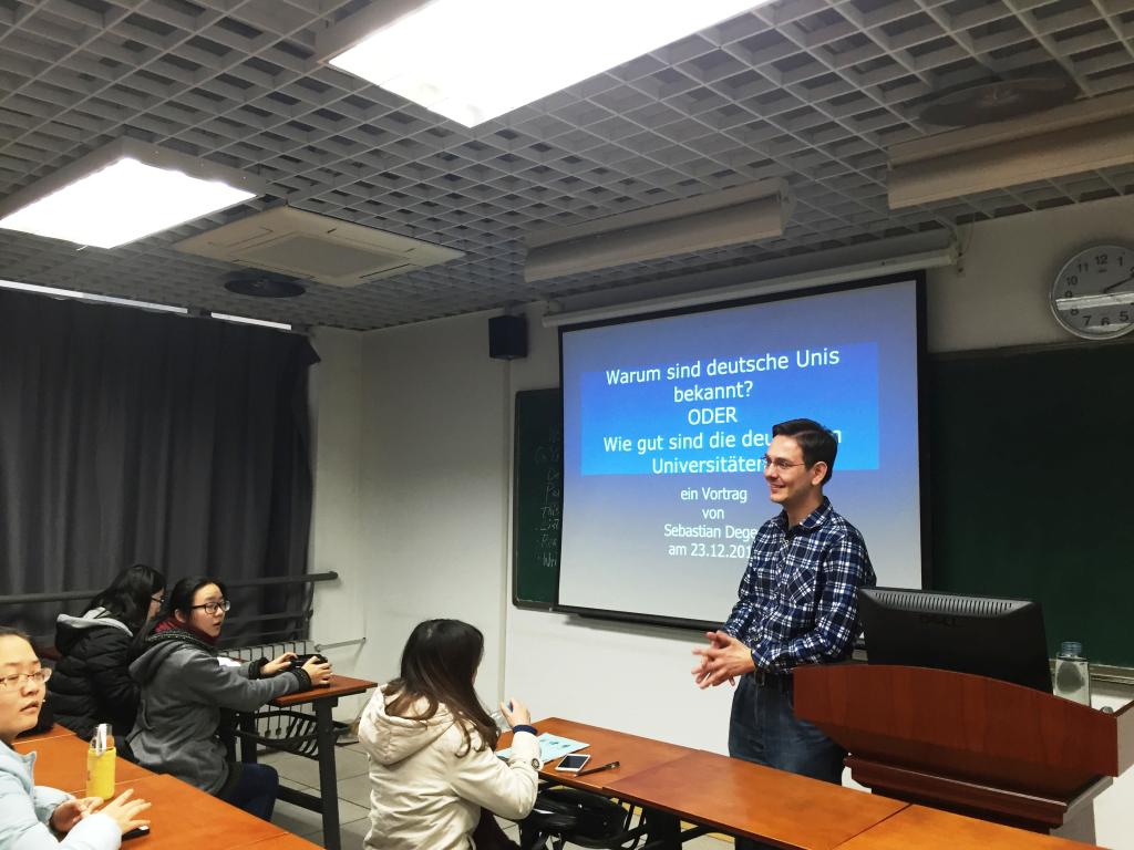 12月23日,外国语学院德语系外教Sebastian Degen先生为英德41班同学们进行“德国高校的发展及其优势”的专题讲座,简要介绍了近代德国高校发展史、现状、优势以及存在问题,并回答了同学们关于留学德国的相关问题。