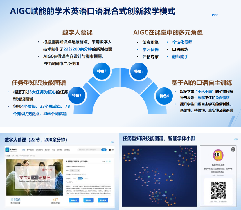 外国语学院钱希带领学术英语教学团队(主要成员:孟亚茹、杨扬、何惠勤、刘秀蓉等)成功入围了全国总决赛,参赛项目题为“AIGC赋能的学术英语口语混合式教学模式的构建与实践”。总决赛分为8分钟的项目报告阐释以及4分钟的专家问辩两个环节,团队负责人钱希代表团队进行了答辩,着重阐释了课程中AIGC融入教学的特色与亮点以及团队开展的相关实证研究,汇报的智课特色包括:依托该课程的陕西省首门数字人慕课、任务型知识技能图谱、智能体“语伴小雅”、基于AI工具的口语自主训练等。专家评委结合项目报告书、项目3D Show展示等,从项目创新创意、技术实现、实用价值等维度进行了综合评价,对于项目的设计以及AIGC在课程全环节的有机融入给予了高度评价,认为该案例具备在全国进行推广的价值。