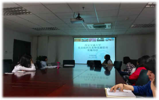 5月25日晚上,外国语学院硕2015级党支部在外文楼B座912会议室召开支部大会,讨论牛江、谭焱丹同志入党申请,并学习《发展党员工作流程》以及《西安交通大学党员组织关系和党籍管理实施办法》。会议由支部书记余碧燕主持,外国语学院硕2015级党支部党员参加。