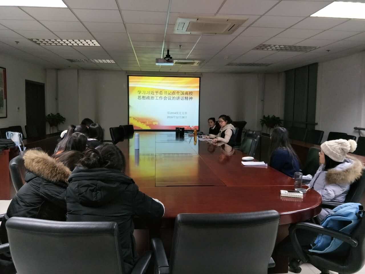 2016年12月28日,外国语学院硕2014级学生党支部在外文楼B912召开了组织生活会,会议讨论并表决预备党员张琪珑同志的转正问题,并学习了习近平总书记在全国高校思想政治工作会议上的讲话精神。