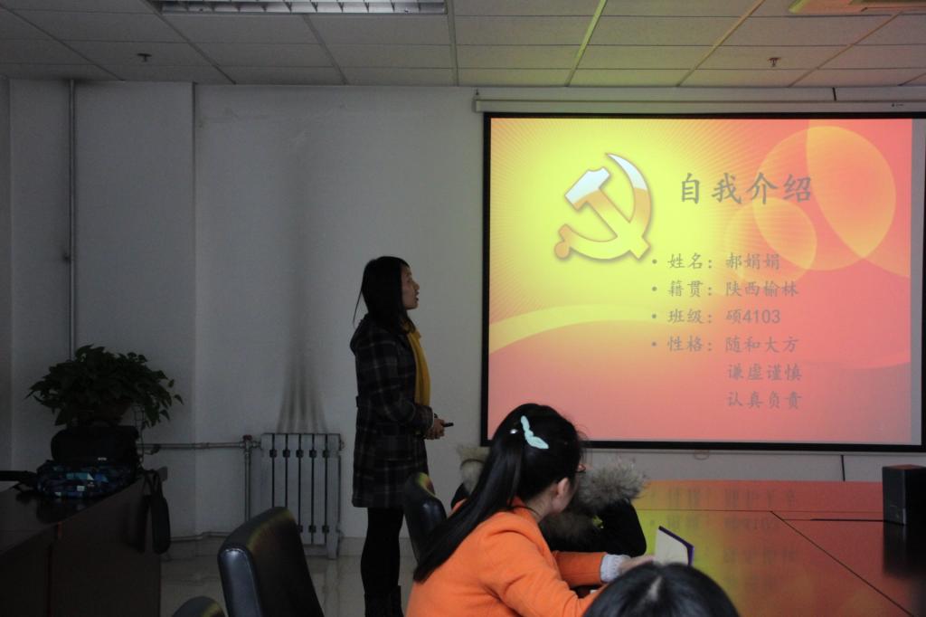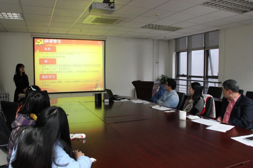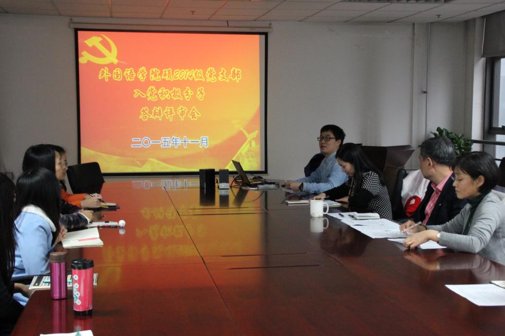 为严格、规范、有序做好2015年度研究生党员发展工作,提高发展党员的透明度和认可度,11月20日下午,外国语学院于外文楼B-912会议室举行党员发展答辩评审会。学院党委副书记张长安,党委委员、法语系主任杨洁,党委秘书李梅,团工委书记、辅导员马薇出席并组成评审组。外国语学院硕2014级党支部9名入党积极分子参加答辩。答辩评审会由支部书记陆天舒主持。