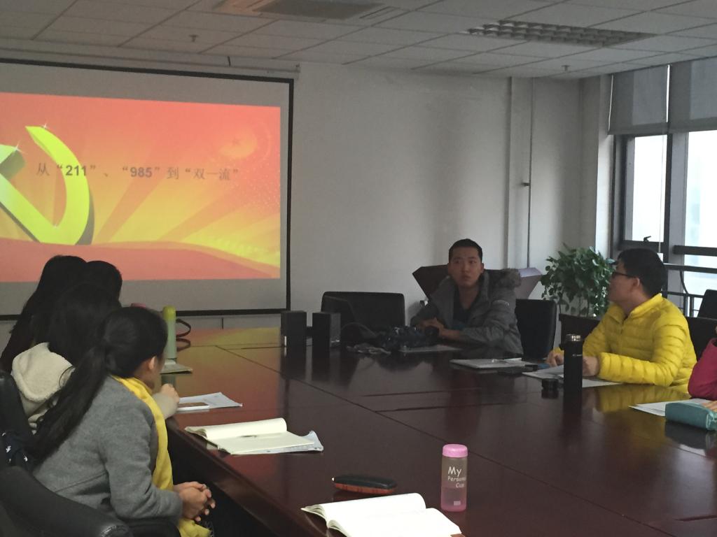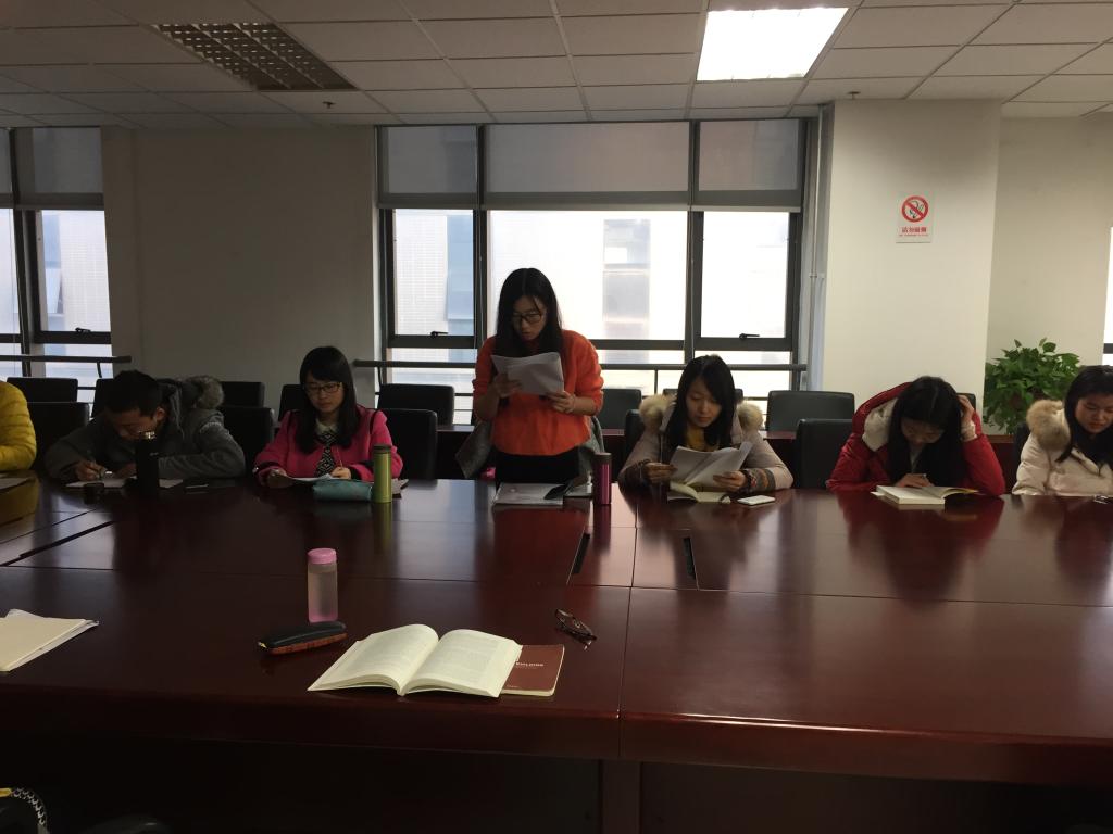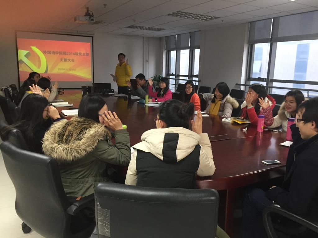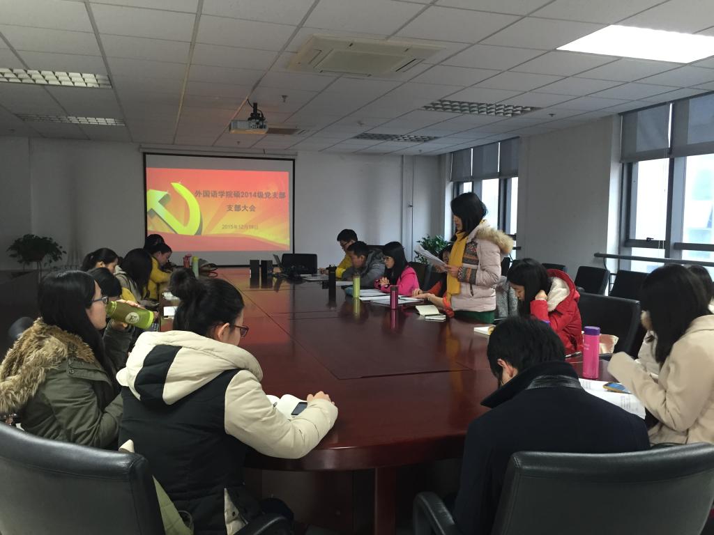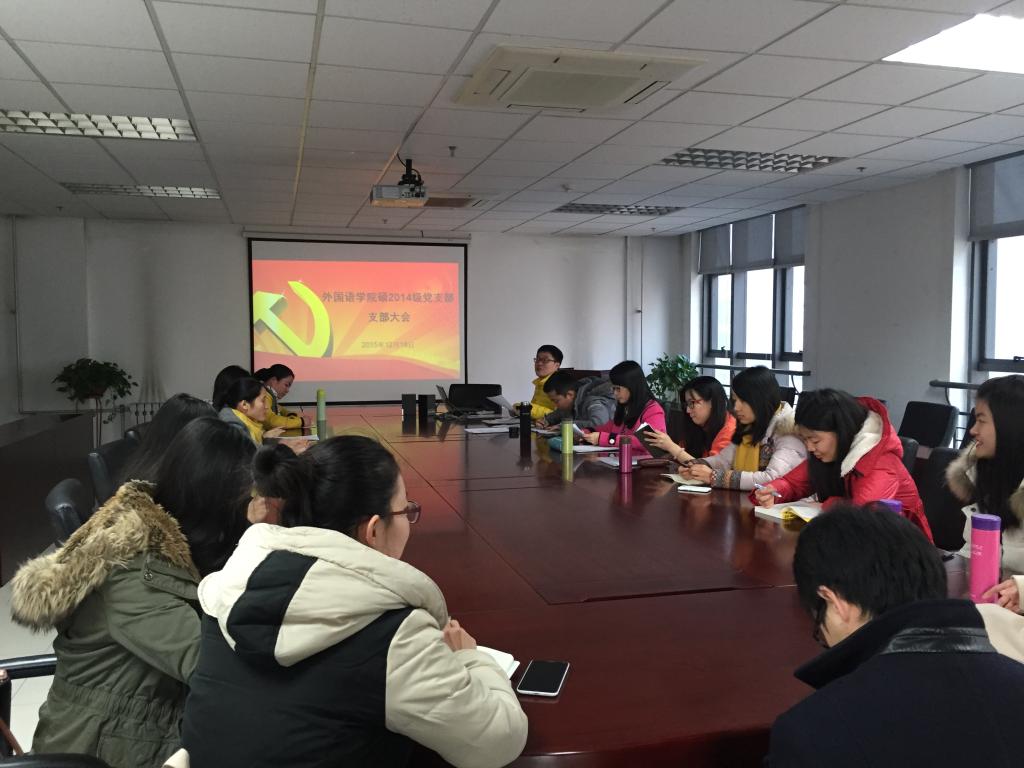 12月18日下午,外国语学院硕2014级党支部于外文楼B912会议室召开支部大会,重点讨论发展对象郝娟娟、张琪珑的党员发展问题。13名正式党员出席大会,会议由支部书记陆天舒主持。