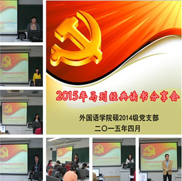 重温马列经典,锤炼党性修养。为深入开展党员理想信念和加强思想道德教育,抓好做实理论研学工作,4月2日下午,外国语学院硕2014级党支部在外文楼B608教室举行2015年第一期马列经典读书分享会。外国语学院团工委书记、研究生辅导员马薇老师应邀出席。硕2014级学生党员、入党积极分子参加学习。读书分享会由支部书记陆天舒主持。
