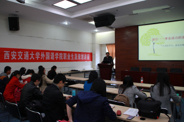 3月20日下午,外国语学院在外文楼B座10楼报告厅举行《诚信——事业成功的基石》讲座,主讲人陕西蕾德曼实业集团有限公司总裁陈健先生同时被聘为外国语学院学生职业规划导师。
