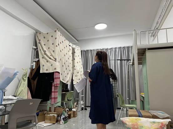 2024年7月10日上午,外国语学院辅导员薛璇玑老师带领兼职辅导员和助管同学,协同物业、后勤保障处工作人员在南区及惠园公寓进行了寝室安全卫生检查工作,以期确保学生居住环境的整洁有序、用电安全无虞,排查可能存在的违禁物品,共创安全文明、整洁卫生、温馨有序的学习和生活环境。