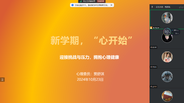 金秋十月,外国语学院S3121班的大家庭于10月23日晚8点,共同参与了一次心灵的盛宴。本次班会以“新学期,‘心’开始”为主题,旨在引导每一位同学关注自我心理健康,学会在新阶段的学习与生活中找到平衡,携手应对压力与焦虑,为未来的每一步奠定坚实的心理基础。
