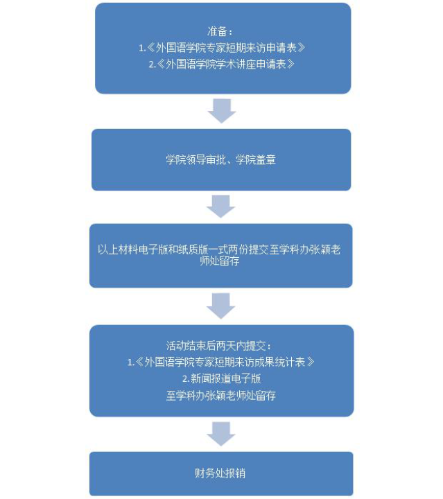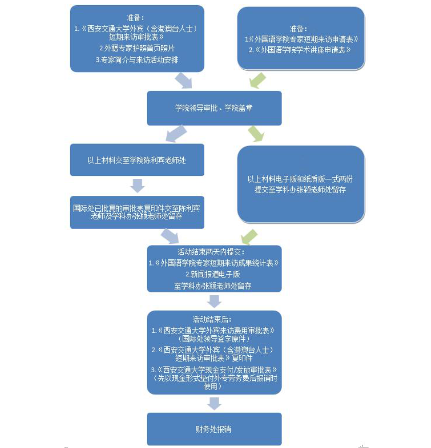 为规范学院对学术交流的管理,配合国际交流处外国专家来校管理制度的实施,规范我院中外专家短期来访的申请审批流程和档案留存规定,方便事后经费报销,特将中外专家进校园短期工作的办理流程做出以下规定:
