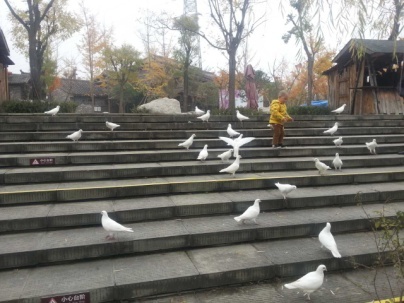 周至水街,号称中国北方第一水街,岸边广场上有许多鸽子,纯白的,个个都长得富态,也不怯人,大人小孩都可喂食,有时会飞落在人的头上,肩上,胳膊上。