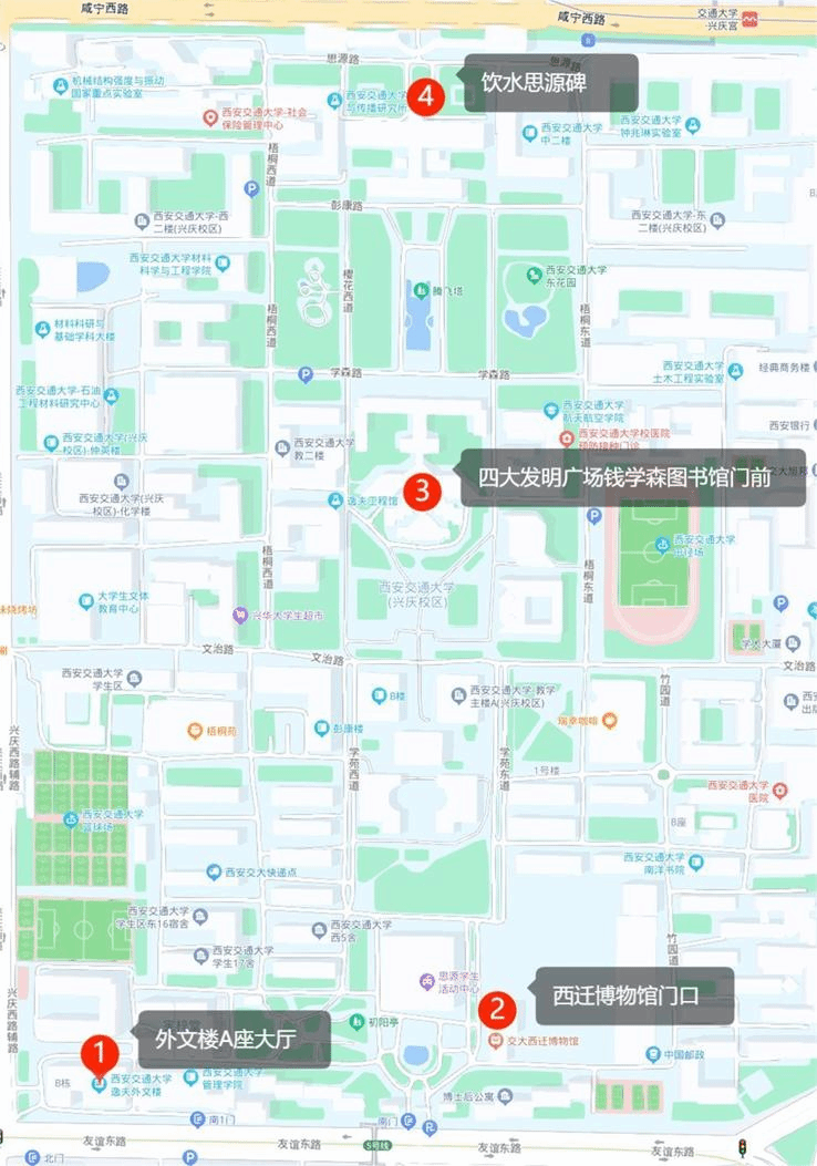 2、从兴庆外文楼发出,在校园内健步走并在指定地点完成 3 次打卡,打卡点如下图。