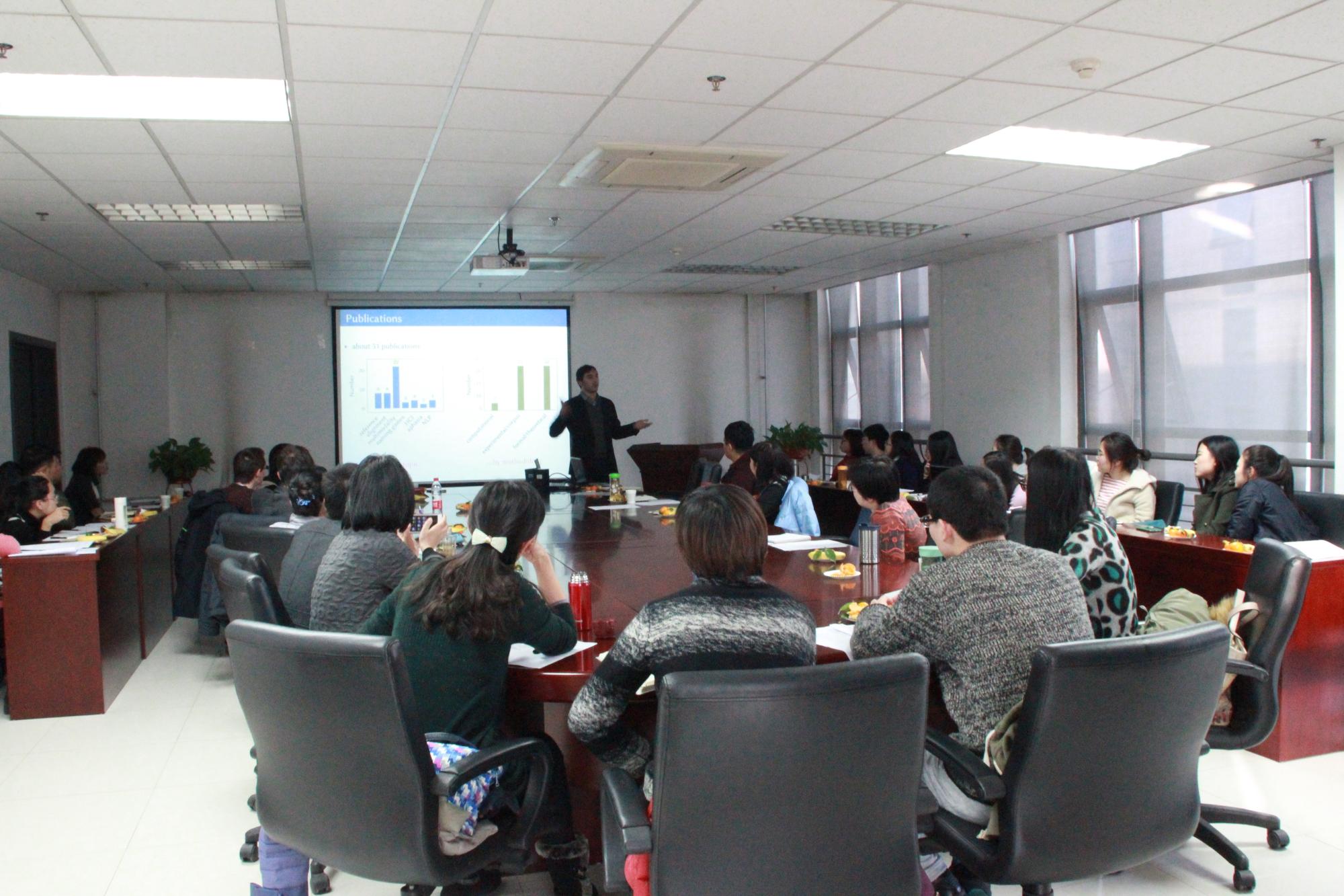 上午9点,交流会在外文楼B912会议室举行。学院领导杨小渭书记、王敏副院长、程冰副院长出席本次交流会。同时参加会议的还有外国语学院教师和研究生。交流会伊始,杨小渭书记向与会学者致欢迎辞。其后,与会学者依次进行自我介绍。依次发言的是Dr. Andy Lucking, 毕业于比勒费尔德大学,现在法兰克福大学Text Technology Lab 攻读博士后;Dr. Christiane Lucking 毕业于德国比勒费尔德大学,现任职于Otto-Fricke医院;Dr.Miroslav Kubat 现任职于俄斯特拉发大学;邹晓龙博士毕业于日本立命馆太平洋大学,现任职于吉林大学公共外交学院;黄文新博士现任职于联合国。在与会学者发言后,王敏副院长就外国语学院的基本情况、学科发展现状等方面进行简短介绍。而后学院各系、中心主任向与会学者详细介绍各中心、专业的教学科研情况。交流会结束后,青年学者参观了外国语学院语言与认知神经科学实验室、同声传译语言实验室等,对外国语学院的科研环境以及设施配备有了更直观深入的了解。