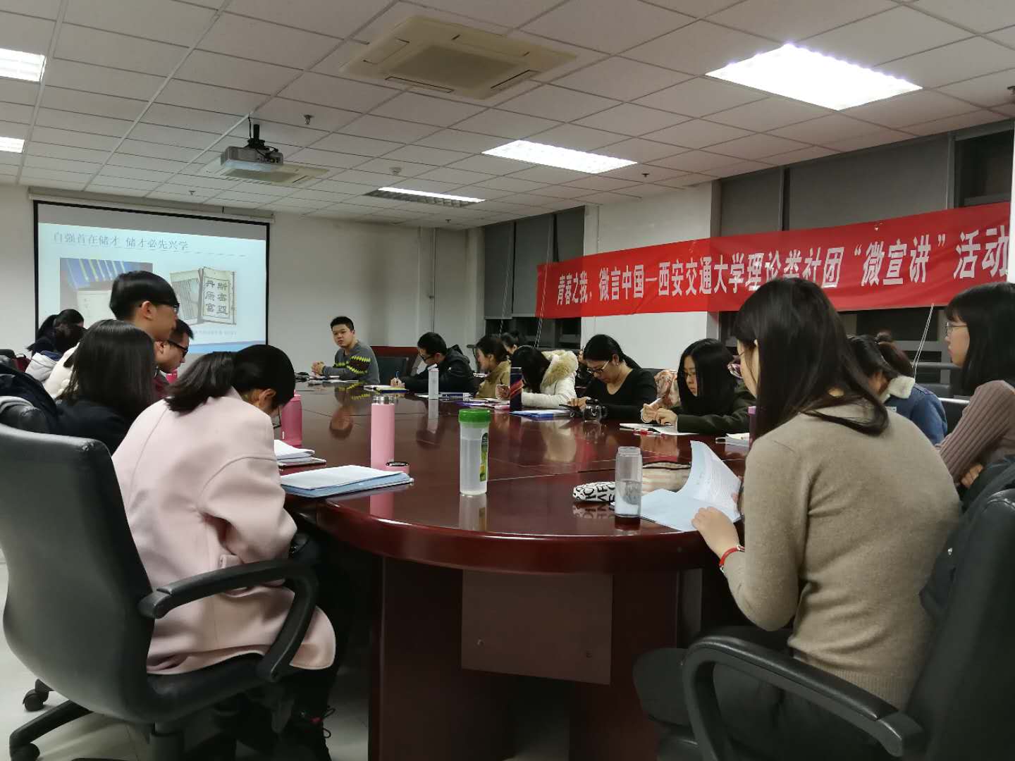 12月6日晚,我校“筑梦社”开展的十九大精神微宣讲在外文楼B912会议室举行,来自外国语学院硕2017级党支部和硕2016级党支部的党员和积极分子参加宣讲活动。