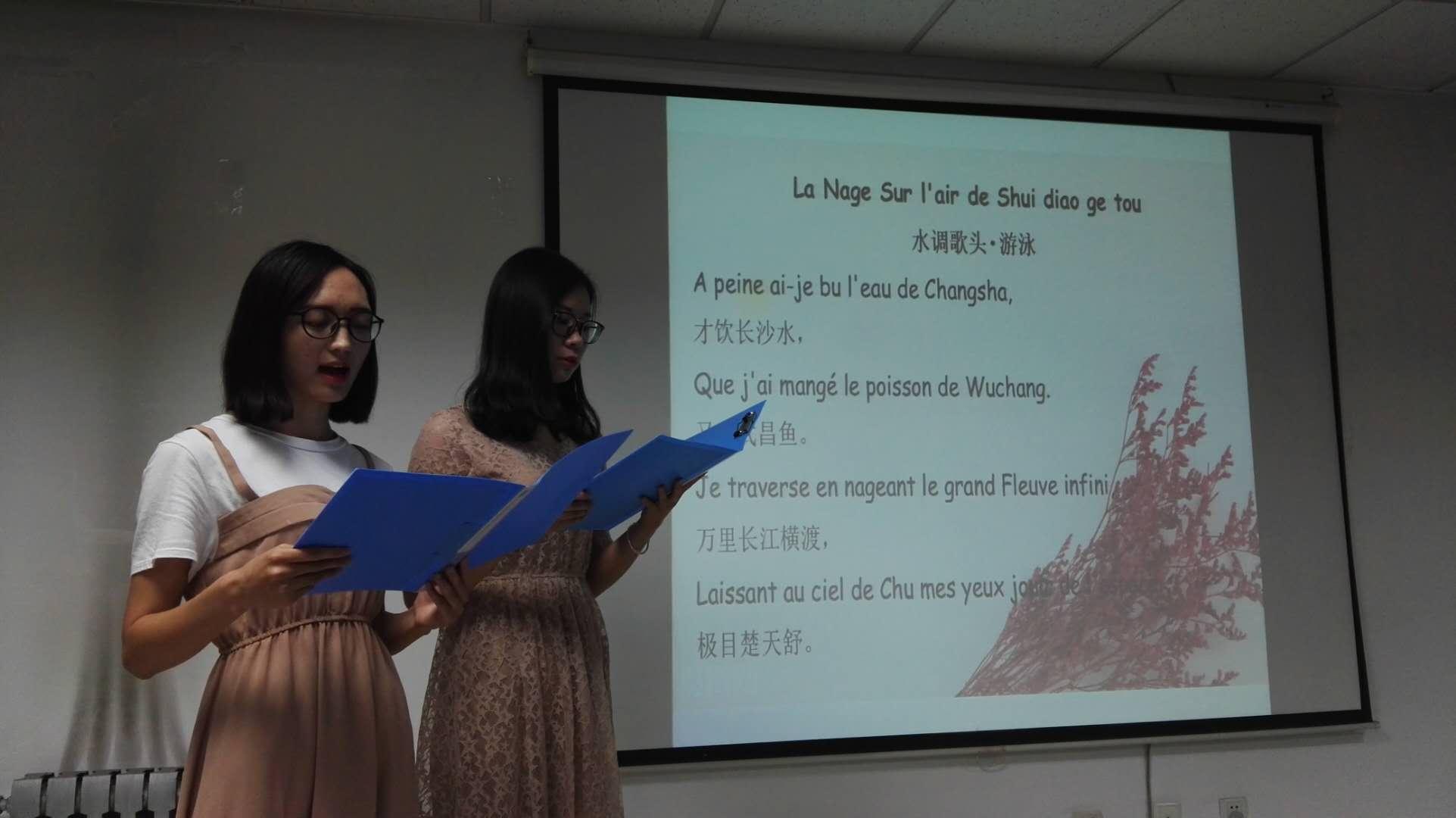 在主持人外国语学院硕2017级党支部书记朱海博激情的介绍中,诵读活动拉开帷幕。党支部书记朱海博首先从学习、继承、批判、革新四个方面介绍了毛泽东诗歌与中国传统文化的关系。积极分子张健和张静慷慨激昂地朗诵了《沁园春· 长沙》。这首诗毛泽东写于1925年,可以感受到他的博大情怀和革命的豪情壮志。党员刘雅恬和积极分子宋爽朗诵了悲壮豪迈的《忆秦娥·娄山关》。这首诗是毛泽东1934年途经娄山时写的,反映了诗人毛泽东虽知长路艰险,但已定下从头做起的决心与勇气。党员马瑞敏和积极分子王闵利朗诵了展现革命气概的《水调歌头·重上井冈山》。这首诗写于1965年,以登井冈山为题材,表达诗人要继续革命的英雄气概。党员苗高扬朗诵了《七律·人民解放军占领南京》。这首诗写于渡江战役时,表现了诗人毛泽东对于革命巨大胜利的激动与喜悦。积极分子展怡和范思颖朗诵了《卜算子·咏梅》。这首诗写于三年自然灾害,毛泽东通过咏梅来表达自己是无私无畏的共产主义战士。党员范蕊与积极分子代晓婷朗诵了酣畅淋漓的《水调歌头·游泳》。这首诗毛泽东写于1956年,正值武汉长江大桥建设时期,反映了长江的宏伟建设和祖国巨大变化。同学们有效地利用了多媒体技术,声情并茂地朗诵使观众产生了强烈的共鸣,赢得了阵阵掌声。在朗诵的过程中,范蕊同学与代晓婷同学用中法双语朗诵了《水调歌头· 游泳》,其他同学均用中英双语朗诵,他们深情的朗诵深深地震撼着每一位观众。