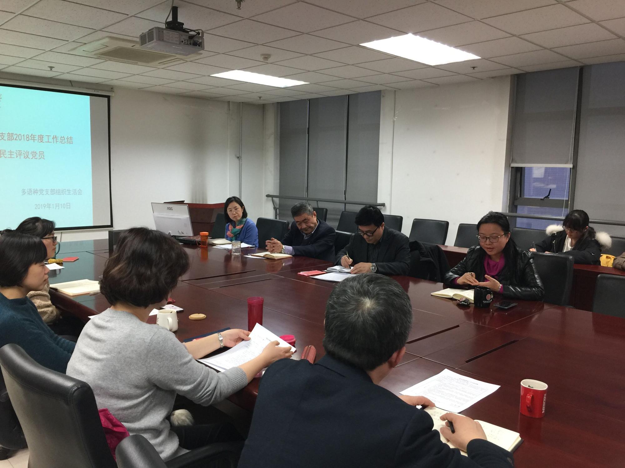 李国栋首先做2018年度支部工作报告,他从发挥政治引领作用、贯彻落实“双一流”建设和创新港内涵建设等工作部署、提高组织生活质量等六个方面,全面回顾总结了支部一年来的工作和取得的成绩,在全体党员的共同努力下,多语种党支部被评为“五好”党支部,入选“双带头人”教师党支部书记工作室,支部党员对支部工作进行评议,填写评议表。
