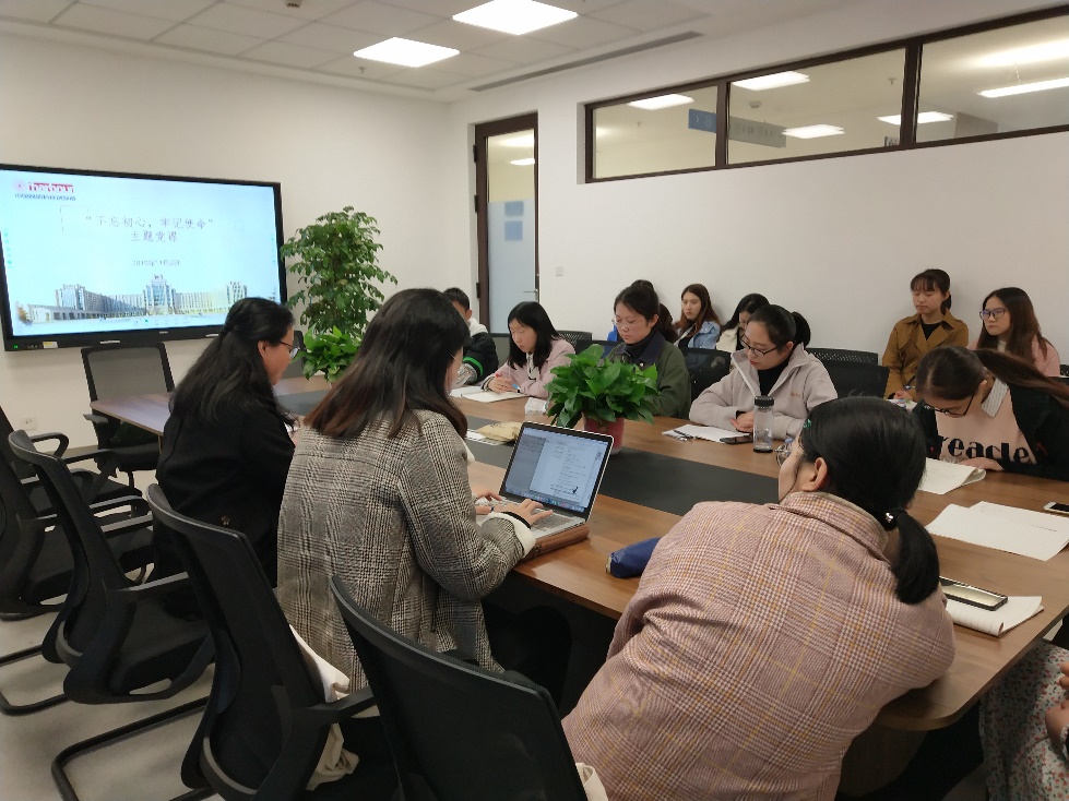 11月6日下午4点,外国语学院2019级研究生班委及党员于创新港5125会议室召开“不忘初心,牢记使命” 主题教育党课学习,外国语学院党委副书记许明老师根据近期学工调研情况就学院学生校园文化建设情况进行了主题发言。