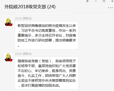 面对突如其来的疫情,应对疾病的挑战,2018级党支部按照中央精神,根据学校文件,树立“停课不停学、居家提升自我”的目标,2月24日晚,召开了线上民主生活会。孔欢、廖新怡两位同学主持会议,外国语学院党委副书记许明老师参会。