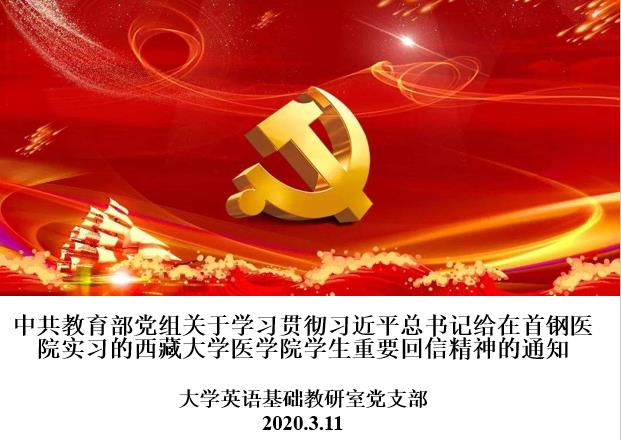 3月11日下午,外国语学院大学英语基础教研室党支部通过微信在线交流的形式召开了本学期的第二次组织生活会。会议的主要议题是讨论“中共教育部党组关于学习贯彻习近平总书记给在首钢医院实习的西藏大学医学院学生重要回信精神的通知”,结合工作实际提出自己的举措和建议。会议由支部书记钱希主持。