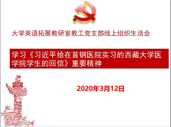 2020年3月12日,大学英语拓展教研室教工党支部在支部微信群召开线上组织生活会,学习、讨论《习近平给在首钢医院实习的西藏大学医学院学生的回信》重要精神。会议由支部书记卢燕华主持,除尚在国外学习的老师外,支部15名党员老师全体参加生活会。
