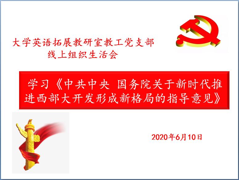 2020年6月10日,根据学校党委部署,大学英语拓展教研室教工党支部在支部微信群召开线上组织生活会,学习研讨《中共中央 国务院关于新时代推进西部大开发形成新格局的指导意见》。会议由支部书记卢燕华主持,学院分党委委员张长安参会,除尚在国外学习的老师,支部15名党员老师全部参加组织生活会。