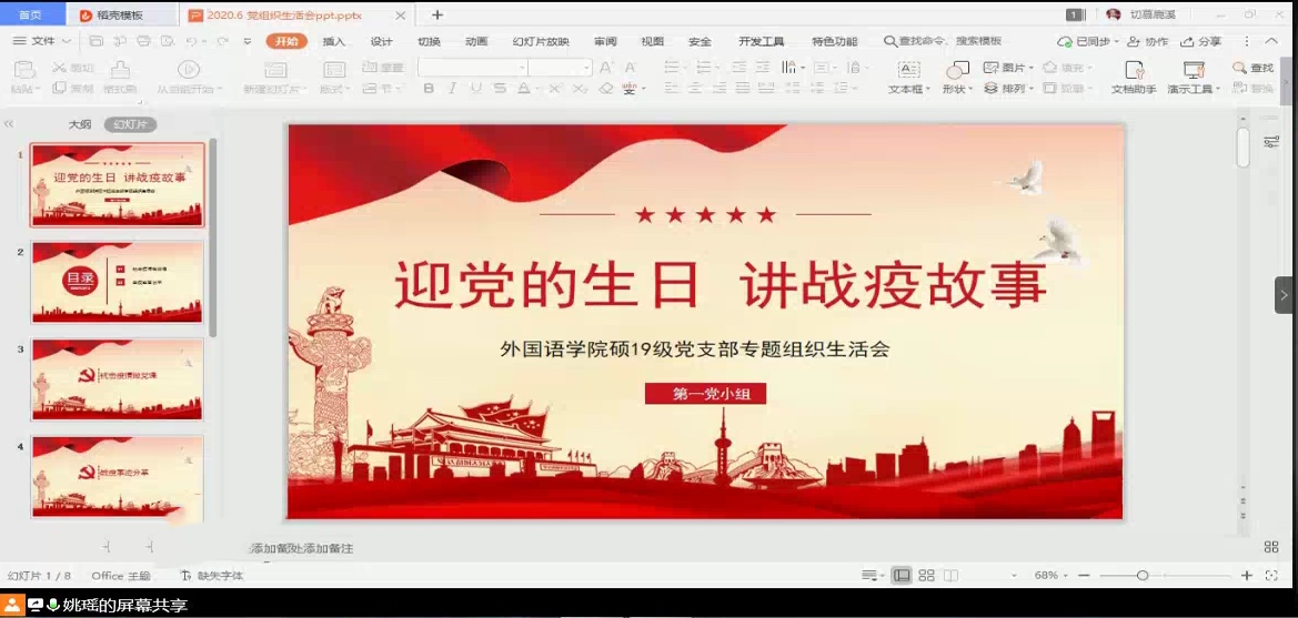 2020年6月30日晚7点,外国语学院硕2019级党支部召开以“迎党的生日,讲战疫故事”为主题的线上专题组织生活会。参加本次会议的人员包括外国语学院硕2019级党支部全体学生党员及积极分子,主持人为姚瑶同志。本次会议主要包含“抗击疫情微党课”和“战疫事迹分享”两部分内容。