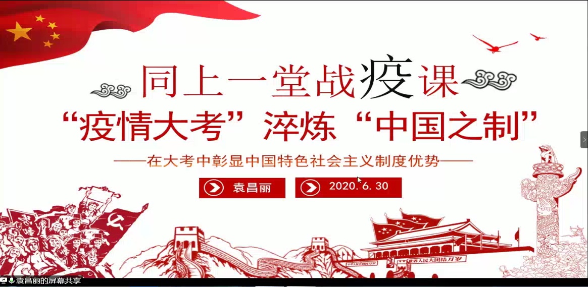 会议伊始,由袁昌丽同志带领大家同上一门战疫课——在“疫情大考”中淬炼“中国之制”。恩格斯说过:“没有哪一次巨大的历史灾难不是以历史的进步为补偿的”。此次疫情期间,在党中央的坚强领导下,全国人民坚定信心、同舟共济、科学防治、精准施策,让中国特色社会主义制度更加完善和健全,在考验我们应对重大风险能力的同时,凸显了“中国之制”的显著优势,并进一步淬炼“中国之制”,使之更加成熟和完善。
