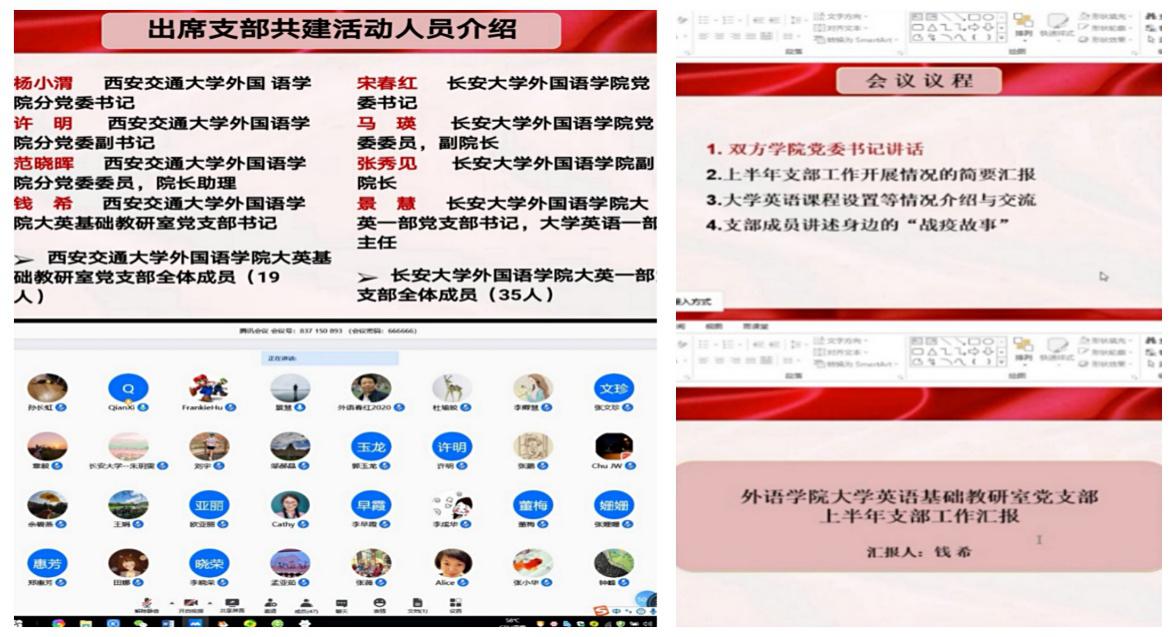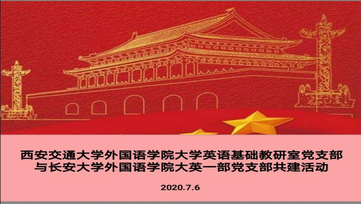 7月6日上午,外国语学院大学英语基础教研室党支部与长安大学外国语学院大英一部党支部通过腾讯会议开展支部共建活动,以共促基层党建,实现党员相互交流学习的目的。双方学院的党委书记、副书记、副院长、党委委员及两个支部党员教师共计50余人出席本次支部共建活动。