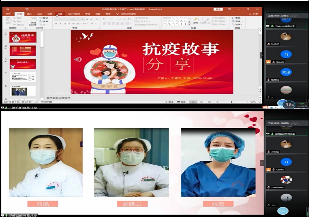 共建活动的最后一项是双方党员讲述身边的“抗疫故事”,我校外国语学院邹郝晶老师讲述了自己的中学同学,我市中心医院护士长和她的同事们的感人故事。长安大学的王婧方老师讲述了自己的妈妈,作为一名一线医务工作者在疫情期间如何忘我工作,照顾发热病人的事迹。两位老师的讲述深情并茂,感悟真挚,让所有参会党员感动不已,同时觉得内心充满温暖和力量。党员老师们纷纷表示要在自己的岗位上发挥党员的先锋模范带头作用,为西部教育事业的发展贡献力量。