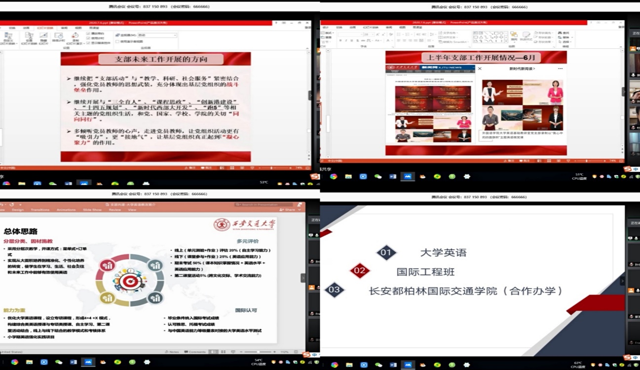 随后,两位支部书记钱希、景慧分别就本支部上半年开展的活动和党员教师在教学科研等方面取得的成绩做了简短汇报,并规划和布置下半年支部工作。大学英语基础教研室党支部开展的“课程思政”专题研讨,“我心中的四面旗帜”系列微党课录制等活动得到了长安大学外国语学院大英一部党支部的高度评价和认可。