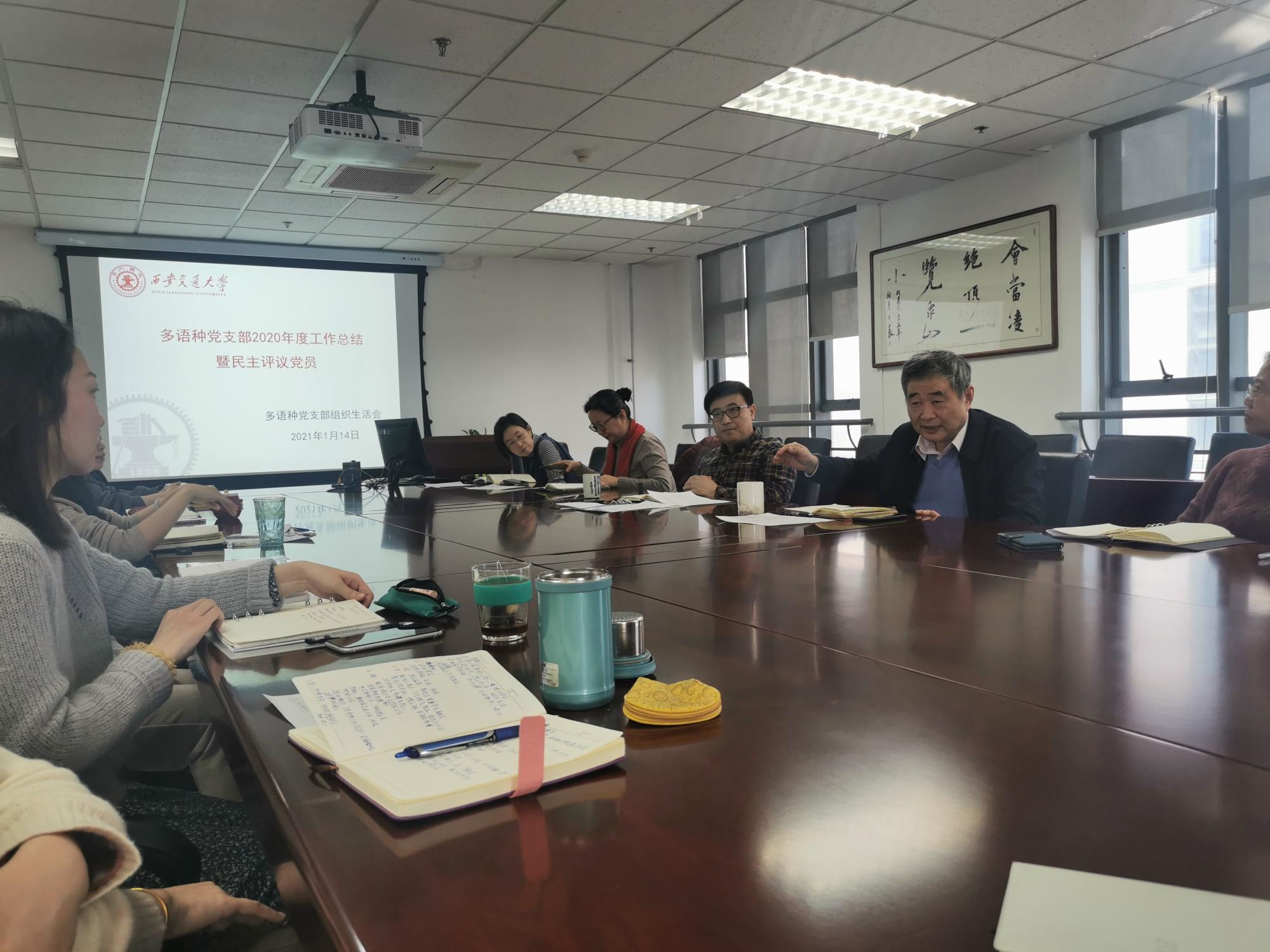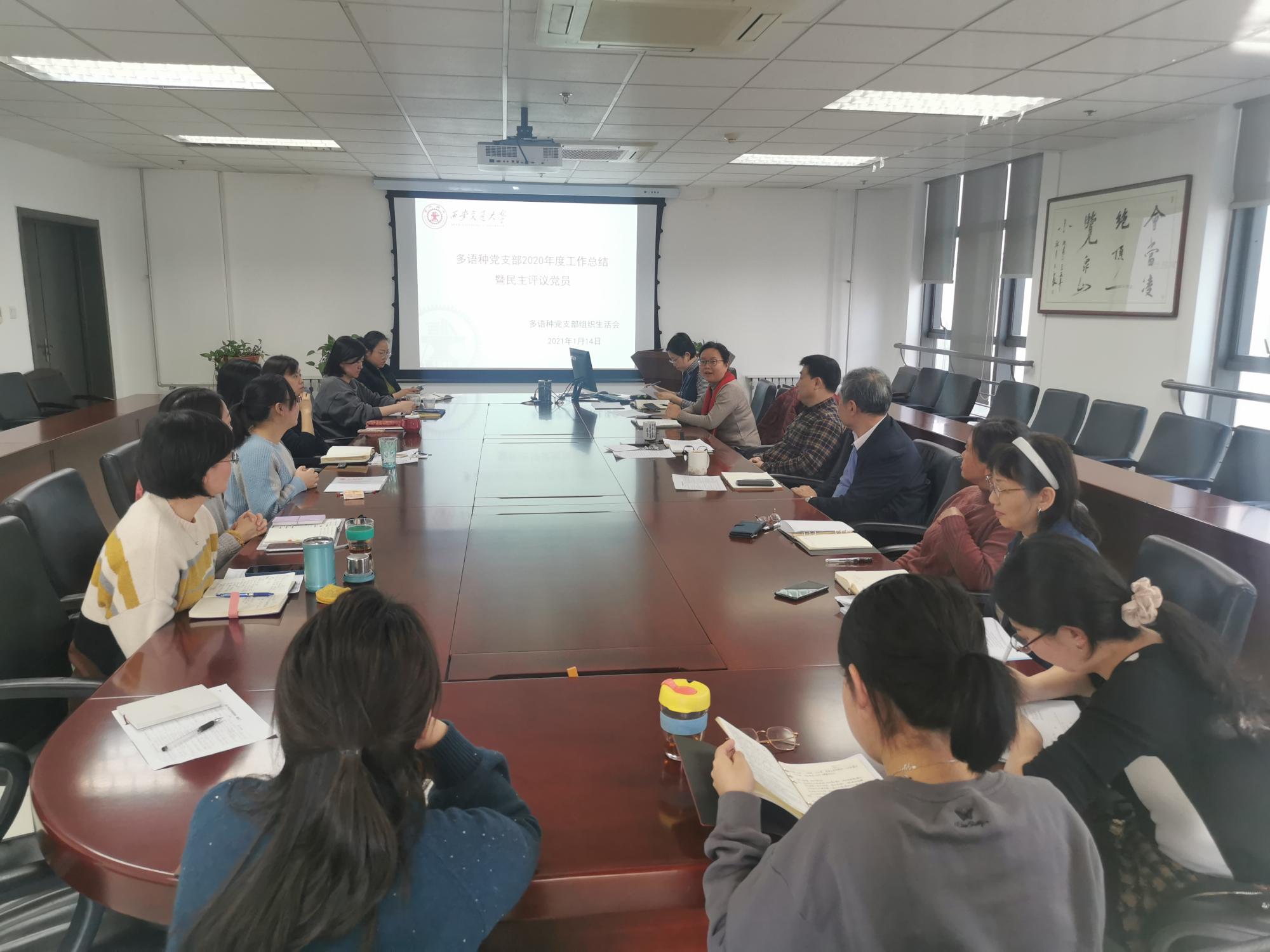 1月14日下午,外国语学院多语种教工党支部在外文楼B912会议室召开支部扩大会议,总结2020年支部工作及民主评议党员。会议由外国语学院党委委员、支部书记李国栋主持。外国语学院党委副书记许明应邀出席会议。外国语学院孟亚茹、寇媛媛、田沛、左佳4位老师作为民主党派、教职工代表应邀列席会议。