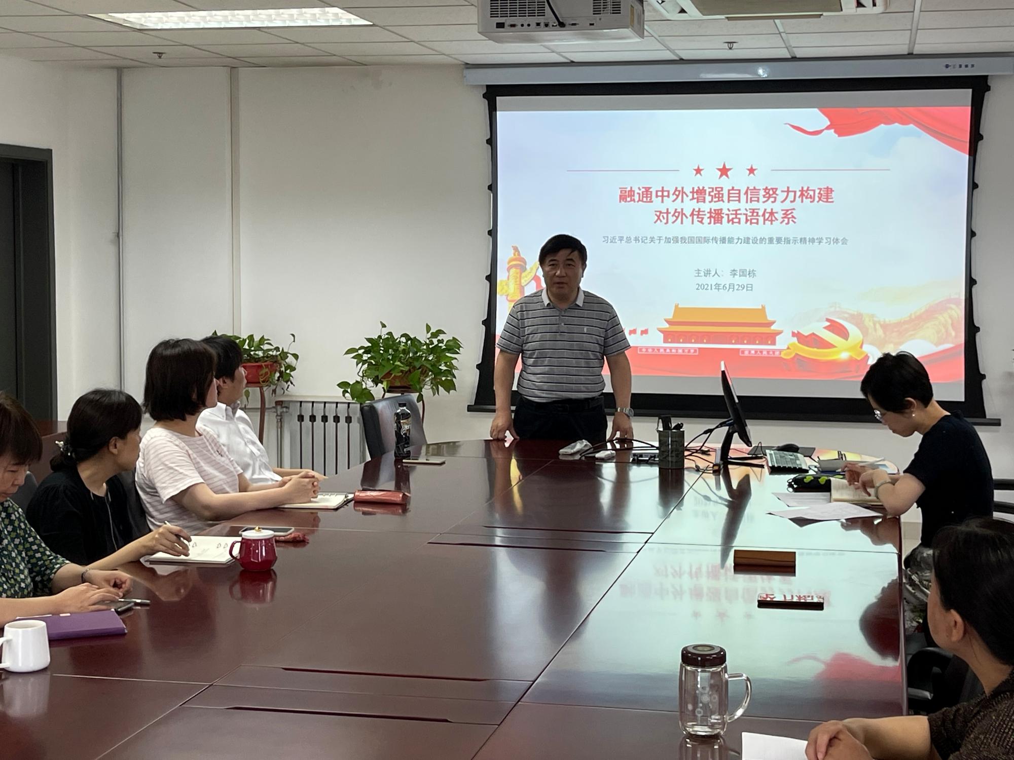 首先,支部书记李国栋以“融通中外,增强自信,努力构建对外传播话语体系”为题做专题党课。他深入浅出进行政策剖析,同时与现实工作中的生动案例有机结合,给与会党员留下深刻印象。