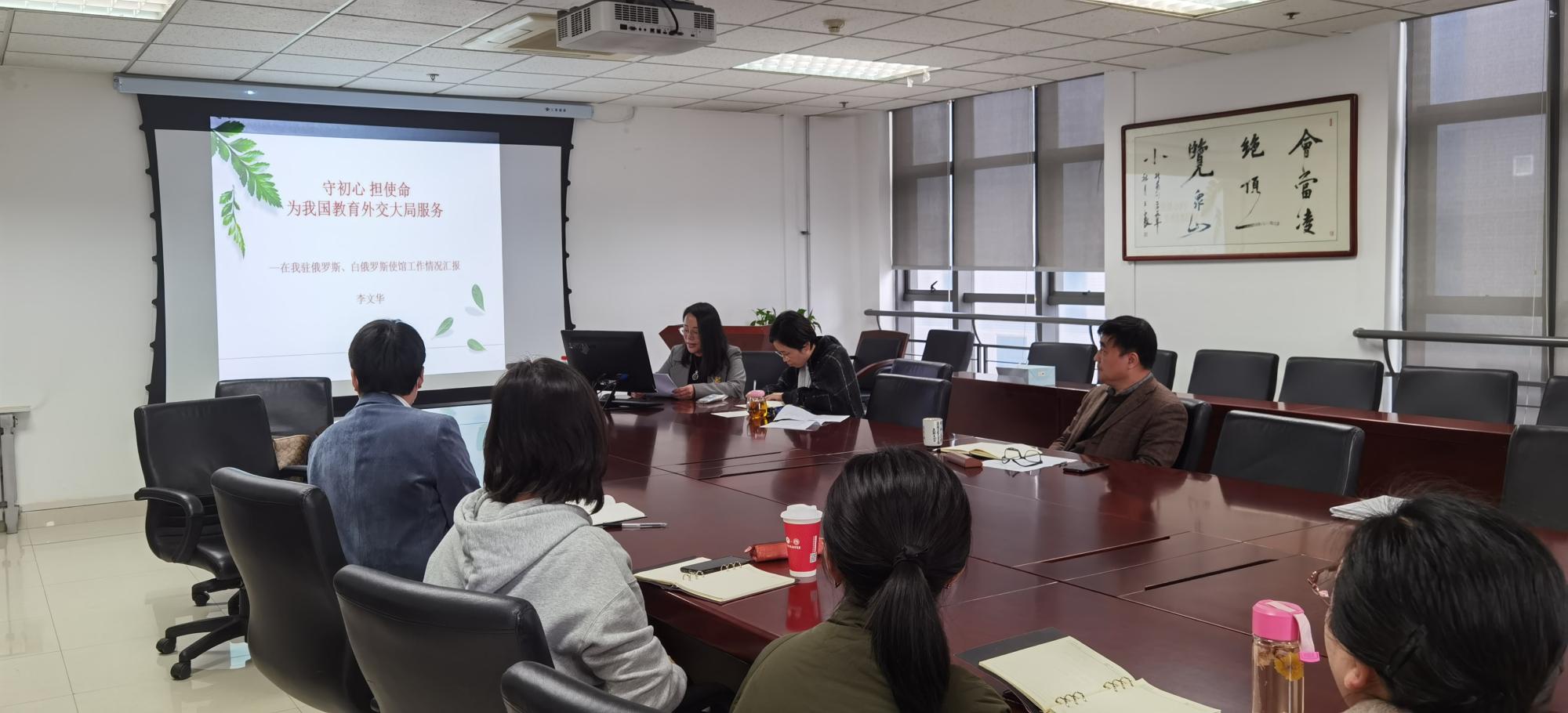 李文华同志首先介绍了借调教育部期间驻外使馆的工作情况,她多次参与国家领导人的访问接待工作,参与组织“中白政府间合作委员会教育分委会会议”、“中国白俄罗斯教育年”等大型外事活动,负责中国留学人员的服务与管理工作,增进两国政府间教育相关部门、学术研究机构的合作与交流等。李老师还分享了在疫情期间,就如何做好管理、服务、引导留学生学习生活的经验。李老师说强大的祖国是教育外交的坚强后盾,并就如何讲好中国故事、搭建好中外教育桥梁分享了自己的感悟。