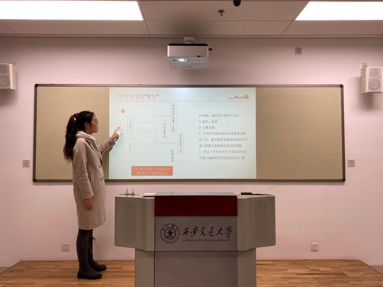 洪霞同学也进行了发言,她表示,值此建党百年之际,党中央郑重召开十九届六中全会,总结过去百年间的成就与历史经验,体现了中国共产党为中国人民谋幸福、为中华民族谋复兴的初心和使命。坚定了全党不畏险阻、迈向复兴的信念。行百里者半九十,全会以“十个坚持”为我党未来工作指明了方向。身为当代青年,我们要树立“四个自信”,努力做担当民族复兴大任的时代新人;砥砺奋进,为成为新时代国家需要的外语人才而不懈努力!