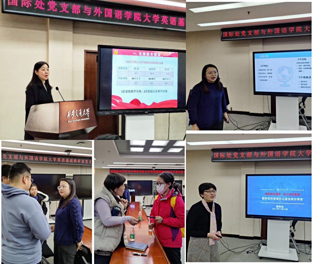 随后,国际处党支部党员同志向与会师生代表分享了服务师生的相关业务并就学生出国留学项目、教师交流互访及助力学院国际化发展等内容展开了积极的互动。大学英语基础教研室党支部老师对于同学们提出的出国留学相关问题也做了详尽的回复。