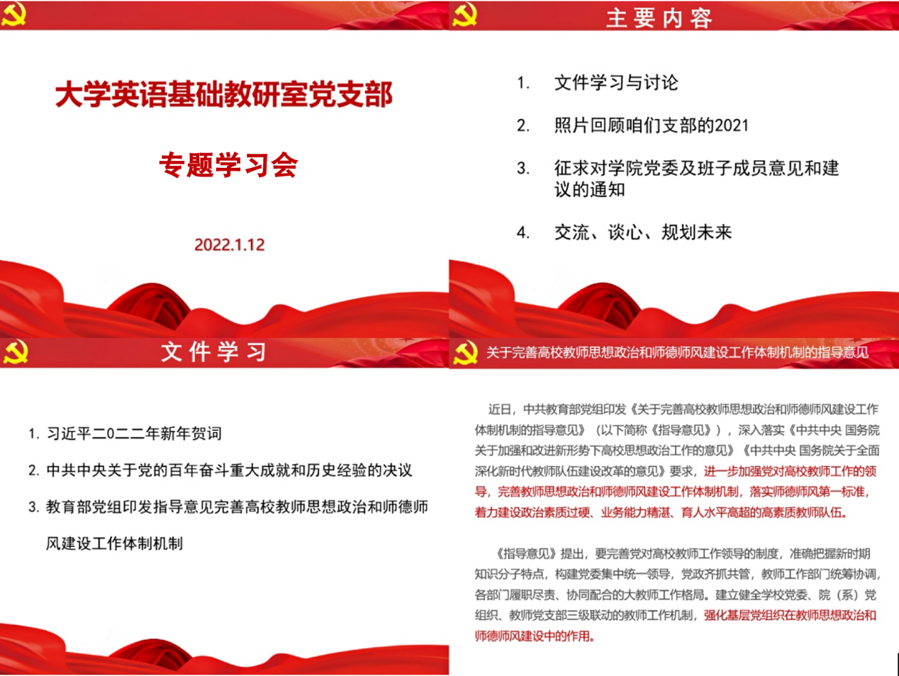 2022年1月12日下午,外国语学院大学英语基础教研室党支部召开线上专题学习会,学院党委委员范晓晖应邀参加,支部书记钱希主持会议。