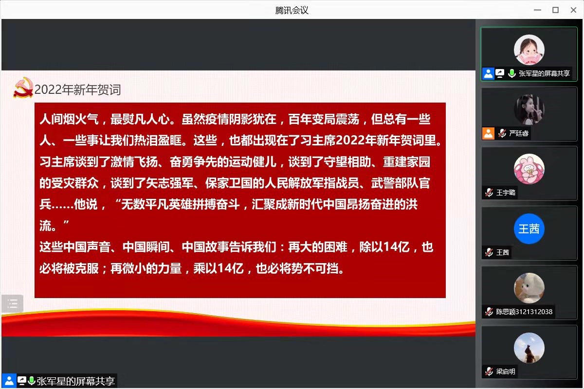 首先,支部成员视频学习习近平总书记2022年新年贺词,张军星从党史历程、国计民生、世界格局和共克疫情四个方面领学习总书记新年贺词重要精神,号召党员与时俱进、关注国家社会需求,全心全意为师生服务。