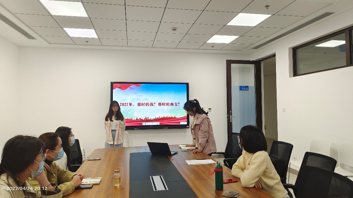2022年4月24日晚,外国语学院硕0119党支部在涵英楼5125会议室与线上腾讯会议同步召开4月份主题党日活动。本次活动的主题为“学习纲要,畅想未来”,主要内容为学习西安交通大学“十四五”规划纲要。本次主题党日活动由硕0119党支部书记刘银萍同志主持。硕0119党支部全体党员及部分积极分子共32人参加了本次活动。