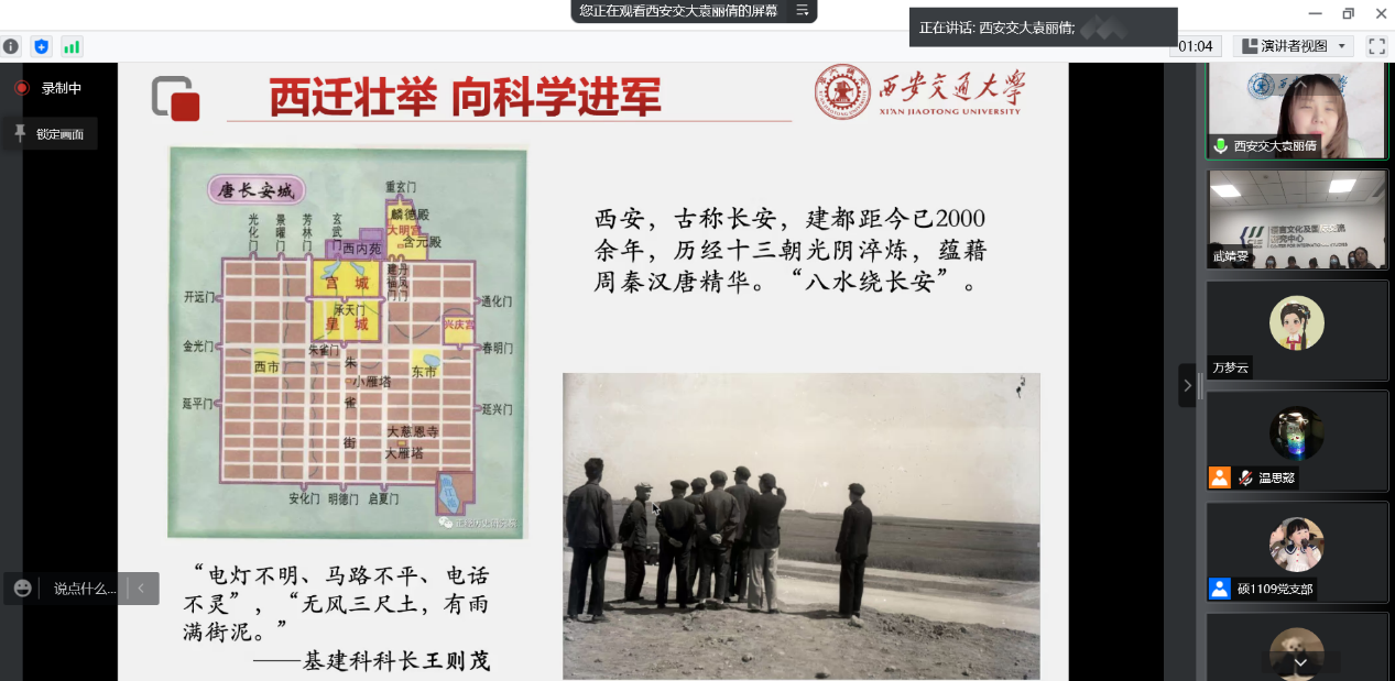 西安交通大学学生微宣讲团成员袁丽倩则为大家带来 “向西,再向西”的主题分享,详细介绍了交大向科学进军的西迁壮举以及其中蕴含的“西迁精神”,鼓励大家向献身大西北建设的西迁老教授们学习,在第四次工业革命的大浪潮中贡献青春力量,肩负起新时代赋予的历史使命。