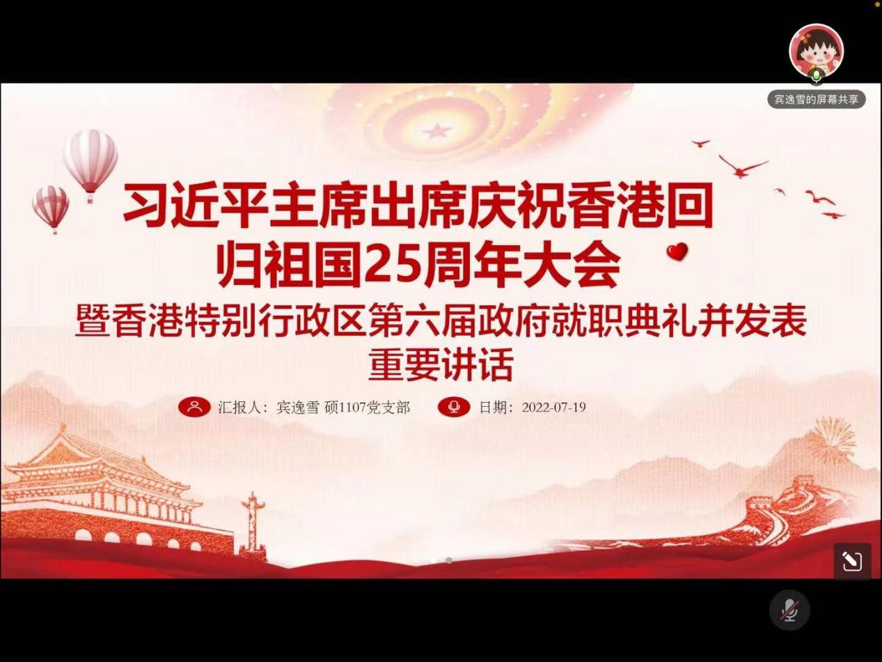 7月19日下午5点,外国语学院硕1107党支部在腾讯会议线上召开“庆祝香港回归,赓续百年奋斗经验”线上微党课,党支部书记李菲主持,宾逸雪,黄英琪,李园媛三位同志分享,支部全体党员及入党积极分子参加学习并交流分享心得体会。