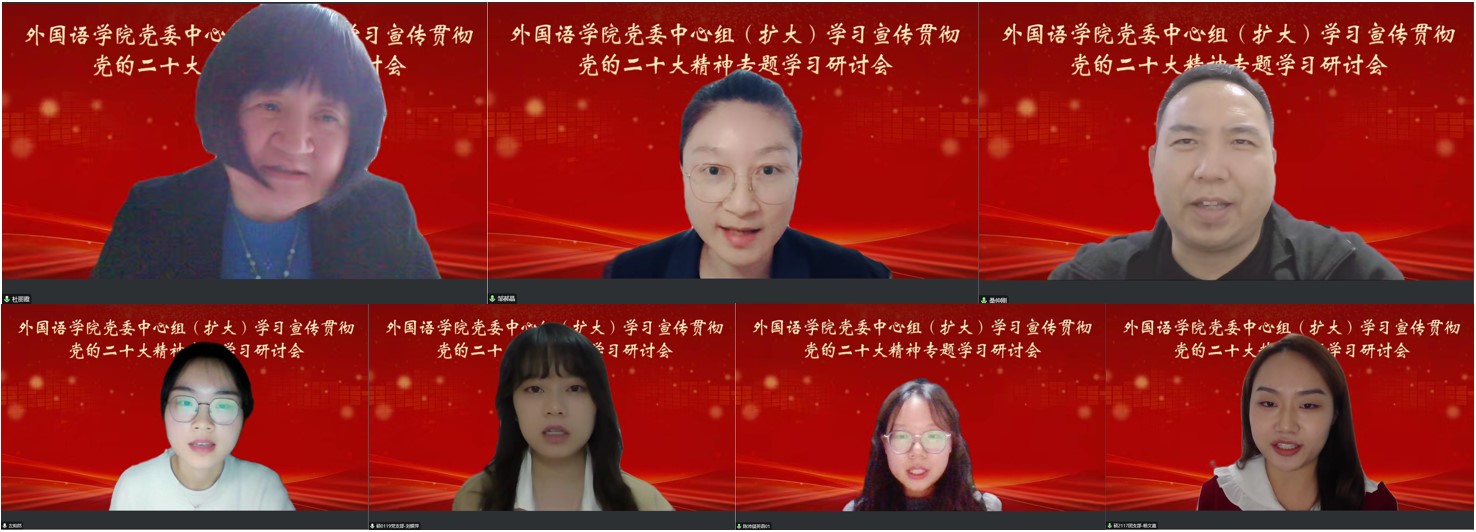外国语学院党委将学习宣传贯彻党的二十大精神作为当前和今后一个时期的首要政治任务,加强工作指导和督促检查,弘扬主旋律、传播正能量,进一步凝聚全院师生共识,引领保障学院各项工作取得更大发展,切实办好人民满意的教育。