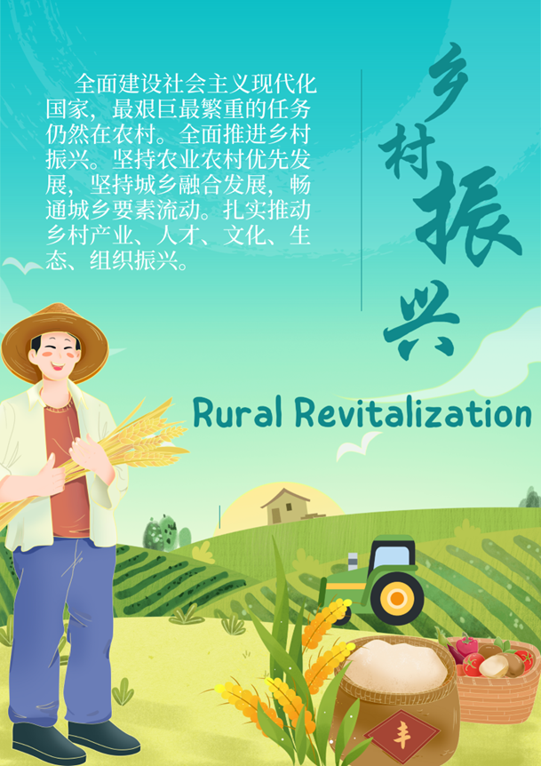 党员陈昕雨为我国乡村振兴取得的伟大成就做了一幅海报。文字部分,增添“Rural Revitalization”体现专业特色,摘录了党的二十大报告中关于乡村振兴内容。图画部分则选择了小麦、农田、农用器械等与乡村生活息息相关的因素,紧扣乡村振兴的主题。