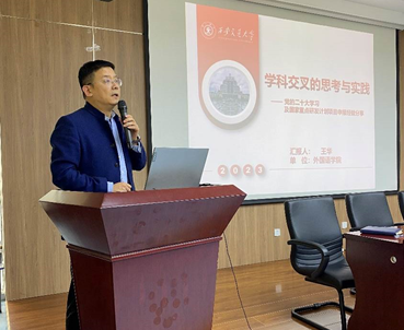 自学习贯彻习近平新时代中国特色社会主义思想主题教育启动以来,外国语学院党委坚持系统谋划、精心组织,扎实推动主题教育。5月8日下午,学院党委邀请省委理论讲师团特聘专家库聘任专家学者王华教授作《学科交叉的思考与实践——党的二十大学习及国家重点研发计划项目申报经验分享》专题报告。报告有学院党委书记张长安主持,学院党政领导、中层干部、师生党员、党外人士近80人参加。