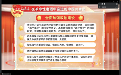 支部随后学习了中国共产主义青年团第十九次全国代表大会报告中的重点内容,理解了大会主题以及十个部分的具体要点。通过对报告重点内容的学习,支部成员对共青团的工作有了更为深刻的认识,也意识到了青年一代对于国家富强繁荣发展的意义。支部成员胡玙玢同学表示,广大青年要有朝气和活力,踔厉奋发,勇毅前行,在全面推进中华民族伟大复兴的历史进程中书写更为绚丽夺目的青春篇章。