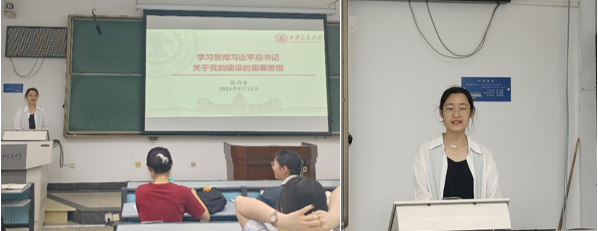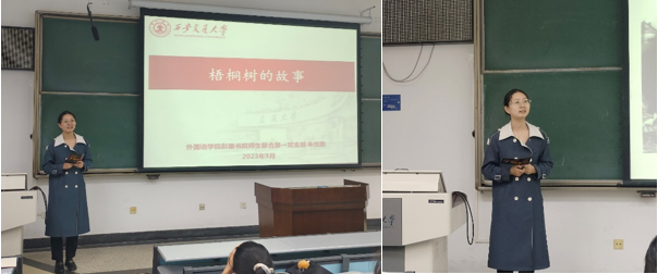 接着,支部继续开展了“党史故事我来讲”活动。朱悦熙同学为大家讲述了交大西迁精神的象征——梧桐树的故事。她用生动的语言,讲述了交通大学西迁的历史背景及西迁历程中的艰辛不易。1956年,交大师生在彭康校长的率领下开始迁校工作,他们离开了繁华的大都市,揣着梦想,揣着激情,揣着报国之志从上海来到西安,从东部沿海来到大西北。如今,支部成员更应弘扬西迁传统,把国家民族的命运与学校命运、个人命运紧密结合在一起,扎根西部,服务国家。