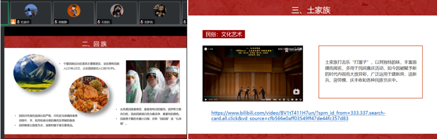会议的第二部分,李梦姣生动地介绍了朝鲜族、回族、土家族和黎族四个少数民族的民俗文化,包括地理位置、饮食文化、建筑结构特点、服饰特点以及当地特色民俗等。她以土家族的打击乐“打溜子”为例,生动地展示了当地的民俗表现形式,使党支部成员对少数民族的民俗文化有了更深入的了解。